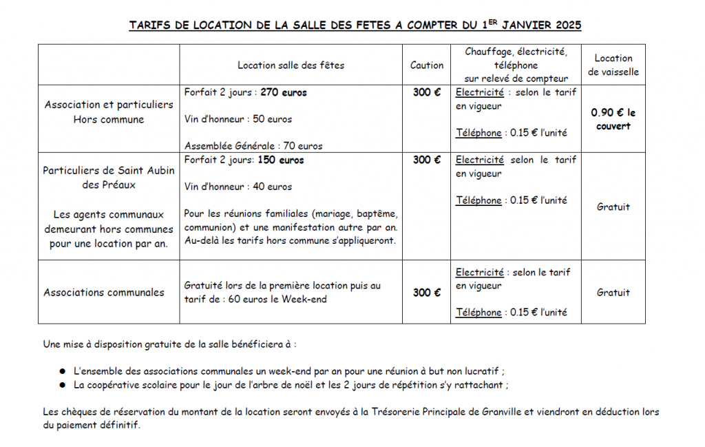 La salle des fêtes de Saint-Aubin-des-Préaux, d’une capacité de 80 places, peut accueillir les habitants de la commune, mais aussi des associations et particuliers “hors commune”.